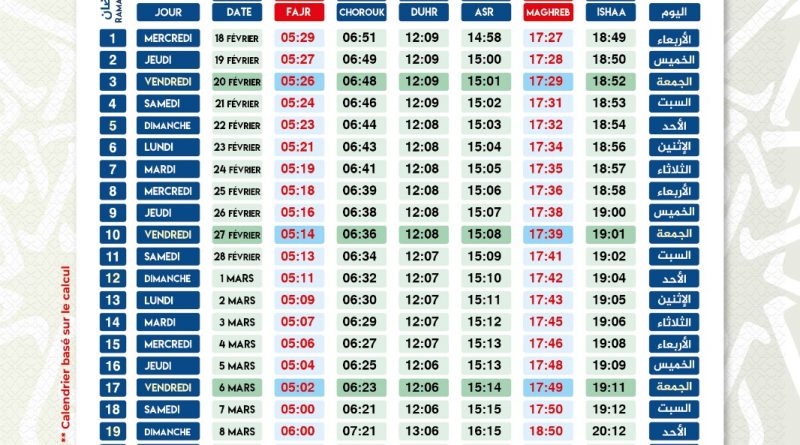 ACTUALITÉSHORAIRES DES PRIÈRESRamadan 2026 mars 20, 2023 admin Horaires des prières Ramadan 2026 Horaire des prières du mois de Ramadan Read More