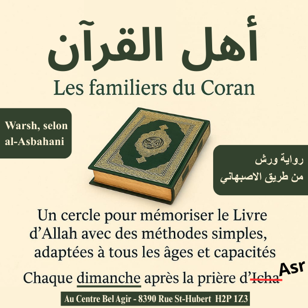 Changement d’horaire pour les leçons de coran du dimanche. Durant le mois de Ramadan, les leçons se donneront après la prière de ASR.