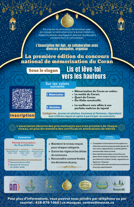 ACTUALITÉSRamadan 2026 Concours de coran national février 16, 2026 admin L’association Bel Agir, en collaboration avec diverse mosquée, organise …